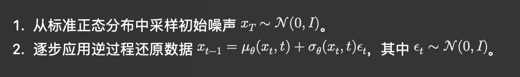 逆向过程是Diffusion模型生成数据的关键。该过程从标准正态分布开始,逐步去噪,最终还原原始数据。逆向过程的目标是学习条件概率分布 (p(x_{t-1} | x_t)),具体步骤如下: