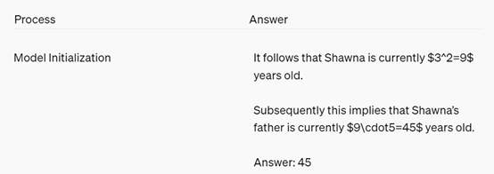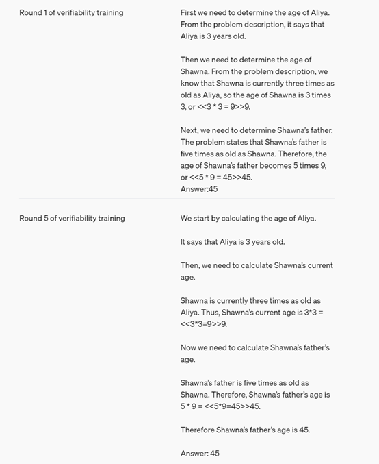 而验证者模型GPT-3需要确定阿莉亚的年龄,然后根据阿莉亚的年龄计算出肖娜的年龄,最后再根据肖娜的年龄计算出肖娜父亲的年龄,整个过程需要多轮验证。