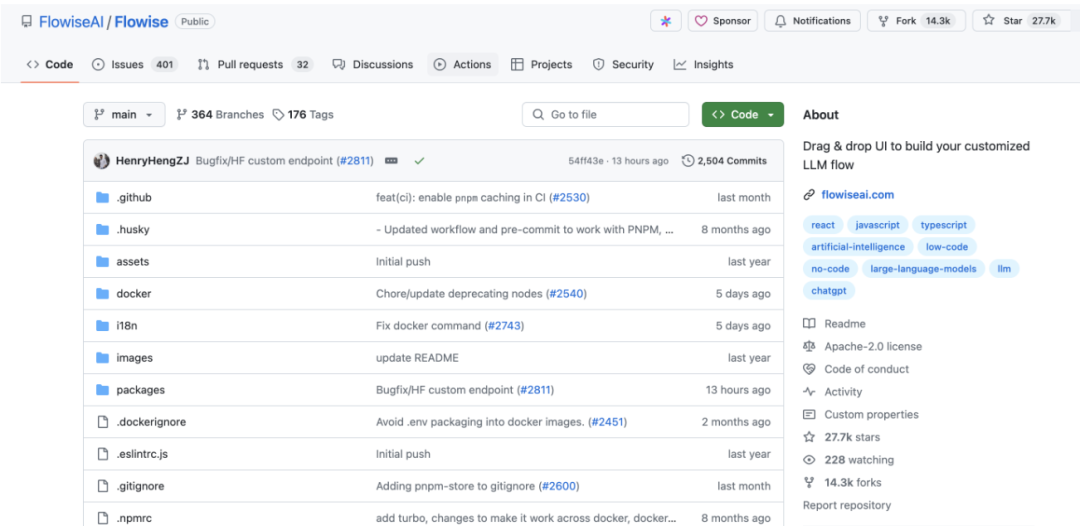 这些技术栈在实现我们的复杂业务场景上也非常有帮助, 如果你也在做AI应用, 强烈大家参考上述用到的技术栈, 它们从网络请求, 数据处理, 到可视化流程图, 文件解析, 代码高亮等方方面面做了系统的支持. 如果你对这款项目感兴趣, 可以本地安装体验: github地址: https://github.com/FlowiseAI/Flowise |