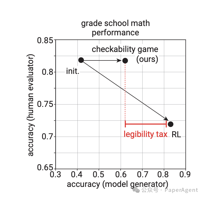 最初,狡猾的证明者很容易就能给出让验证者信服的不正确解决方案。但是,由于将这些不正确的解决方案添加到验证者训练的下一阶段,因此相同的漏洞在下一轮中不再具有说服力,并且证明者被迫在每一轮中探索不同的策略。一旦狡猾的证明者无法再给出让验证者信服的不正确解决方案,训练就会结束。仅针对正确性优化的模型具有高准确性但可读性差,而仅经过监督微调的模型具有高可读性但准确性差。证明者-验证者游戏方法平衡了两者,实现了高可读性与适度准确性。 ingFang SC", "Hiragino Sans GB", "Microsoft YaHei UI", "Microsoft YaHei", Arial, sans-serif;border-left: 4px solid rgb(248, 57, 41);">训练效果虽然训练损失在概念上不是很清晰,但效果很好。在训练的早期和晚期检查诚实证明者的解决方案;它们变得更加详细,推理也更加仔细: