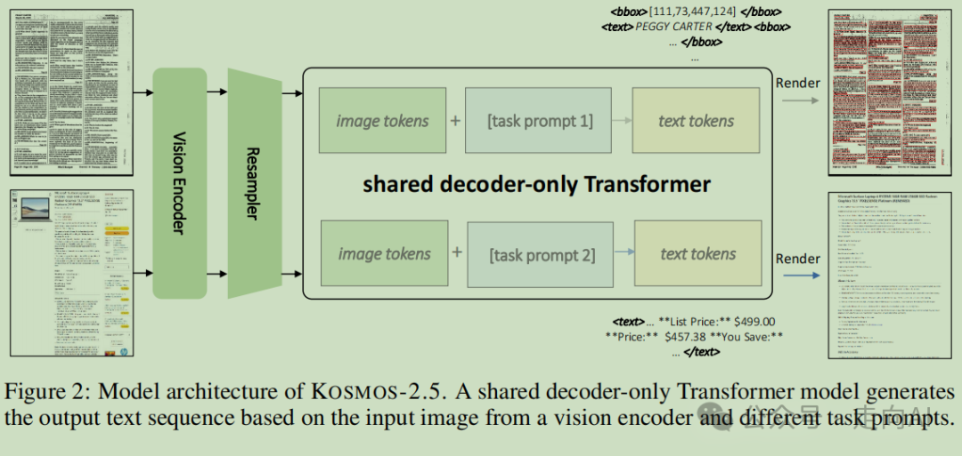 1. 多模态端到端整合:KOSMOS-2.5结合了视觉编码器和文本解码器,通过重采样模块连接,实现了文本和视觉信息的整合处理,模型能够同时完成检测文本内容和坐标、生成Markdown格式文本的任务,提供了端到端的解决方案。