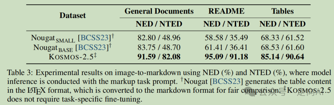 • 图像到Markdown任务:与Nougat相比,KOSMOS-2.5方法显著提高。例如,在README数据集上,KOSMOS-2.5在NED方面比Nougat BASE提高了33.68%(95.09% vs. 61.41%)。此外,在文档数据集上,KOSMOS-2.5在NTED方面也将性能提高了33.38%(82.08% vs. 48.70%)。