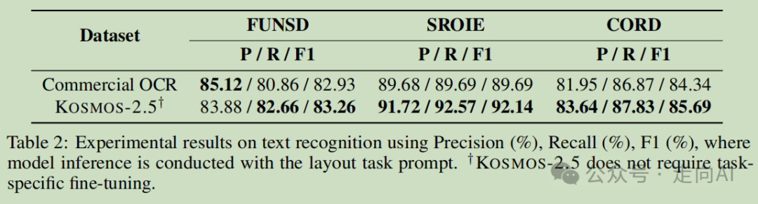 • 文本识别任务:KOSMOS-2.5在F1分数方面分别比Google文档OCR高出0.33%,2.45%和1.35%,展示了其有效性。