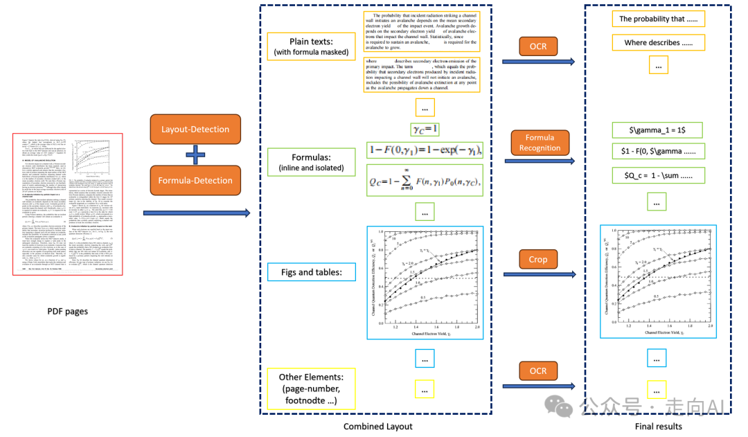 ingFang SC", miui, "Hiragino Sans GB", "Microsoft Yahei", sans-serif;font-size: 14px;letter-spacing: 0.5px;text-align: start;background-color: rgb(255, 255, 255);white-space-collapse: preserve !important;word-break: break-word !important;">ingFang SC", "Hiragino Sans GB", "Microsoft YaHei UI", "Microsoft YaHei", Arial, sans-serif;font-size: var(--articleFontsize);text-align: justify;">可以看到这里面最核心的部分是基于模型的解析模块:PDF-Extract-Kit而根据官方链接介绍的PDF-Extract-Kit包括以下几个模块: 布局检测:使用LayoutLMv3模型进行区域检测,如图像,表格,标题,文本等,由于文档类型的多样性,现有开源的布局检测和公式检测很难处理多样性的PDF文档,为此作者团队采集多样性数据进行标注和训练,使得在各类文档上取得精准的检测效果; 公式检测:使用YOLOv8进行公式检测,包含行内公式和行间公式; 公式识别:使用UniMERNet进行公式识别,这个方法是上海AI lab前段时间开源的公式识别模型,作者自己说法是可以媲美商业软件,在各种类型公式识别上均匀很高的质量,实际体验效果确实不错,; 光学字符识别:使用PaddleOCR进行文本识别; ingFang SC", miui, "Hiragino Sans GB", "Microsoft Yahei", sans-serif;font-size: 14px;letter-spacing: 0.5px;text-align: start;background-color: rgb(255, 255, 255);white-space-collapse: preserve !important;word-break: break-word !important;">ingFang SC", "Hiragino Sans GB", "Microsoft YaHei UI", "Microsoft YaHei", Arial, sans-serif;font-size: var(--articleFontsize);text-align: justify;">流程图如下:
