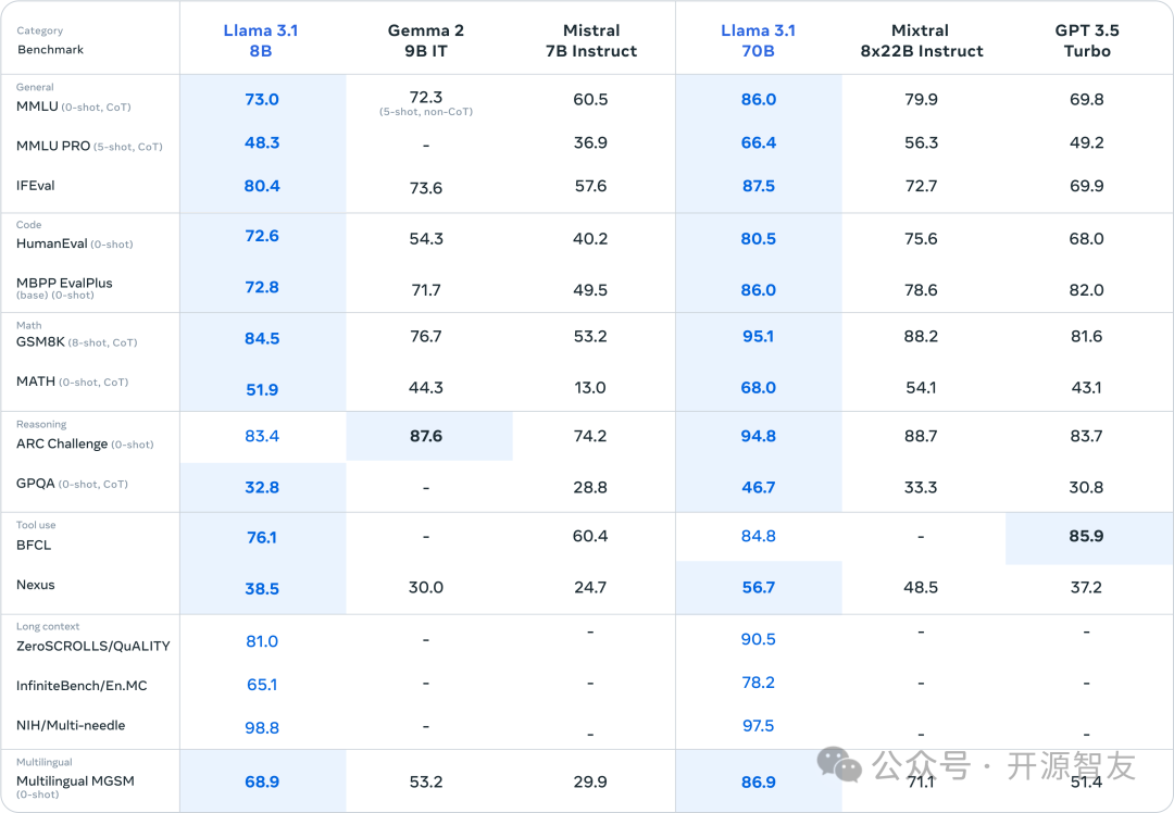 在代码、数学等测试模型的认知、推理能力的基准中,Llama3.1-8B-Instruct取得了令人振奋的成绩,具备和GPT 3.5 Turbo相接近的综合能力水平: