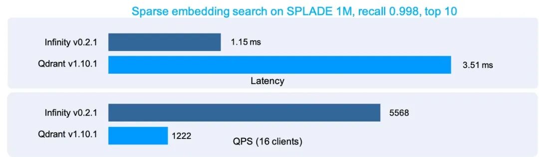 下图是 Infinity 跟知名向量数据库 Qdrant 在稀疏向量索引上的性能评测: