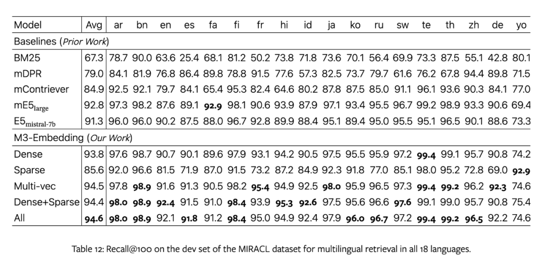 [0.2,0.3,0.5,0.7,......][{331:0.5},{14136:0.7}]把文本转为稀疏向量最知名和有代表性的工作就是 SPLADE (参考文献 [1]),它利用一个标准的预训练数据,将文档中的冗余词删除,并且增加扩展词,从而形成一个标准的 3 万维的稀疏向量输出。这里的冗余词删除,其实就类似传统搜索引擎中分词过程中的“去停用词”(在构建索引的过程中,将英文中的 the、a、等频率很高但信息密度很低的词跳过,这并不影响整体召回的效果,中文也同样的道理);增加相应扩展,也类似传统搜索引擎的查询同义词等扩展技术。站在使用的角度,它可以把任何文档都表征为一个 3 万维的稀疏向量,向量每个维度表征这个单词的权重。在典型的信息检索 ( Information Retrieval) 评测任务中,采用 SPLADE 稀疏向量取得了比传统搜索引擎基于 BM25 排序方式更好的表现。而利用稀疏向量 + 稠密向量的混合搜索,其效果在近期的一篇采用 BGE M3 embedding 模型的论文中也得到了验证(参考文献 [2]),在典型评测中,取得了比 BM25 要好很多的效果: