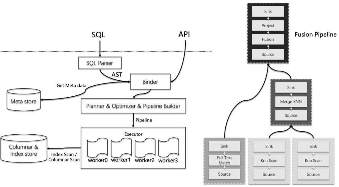 上图的右边是一个多路召回的查询样例,图中包含 2 个数据 segment 上的向量搜索执行算子,2 个算子并行执行,以及一个向量搜索的 Top K 合并算子负责合并来自 2 个 segment 的向量搜索结果;还有一个全文搜索算子,两路召回最后是一个 Fusion 融合算子,这些算子在内存中形成一个 DAG 图,由查询执行器负责运行期调度。