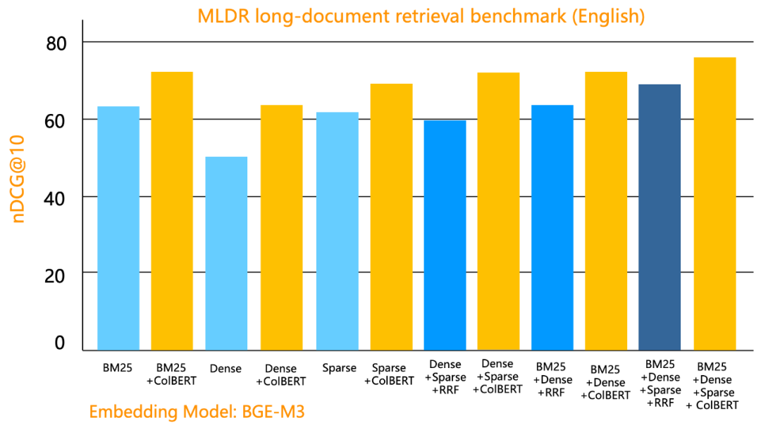 需要说明的是,在不同数据集上,相同的召回手段可能得到不同的返回结果,但有一点是确定的,就是混合搜索的手段越多,返回质量越好。此外,上边的评测并没有涵盖用 Tensor Index 做 Ranker 组合,这是因为在具体实验中,我们发现用 Tensor 做 Reranker 的性价比要高很多,这会在我们后边的文章中详细阐述。因此推荐的最佳混合搜索方案是 Blended RAG + ColBERT Reranker。