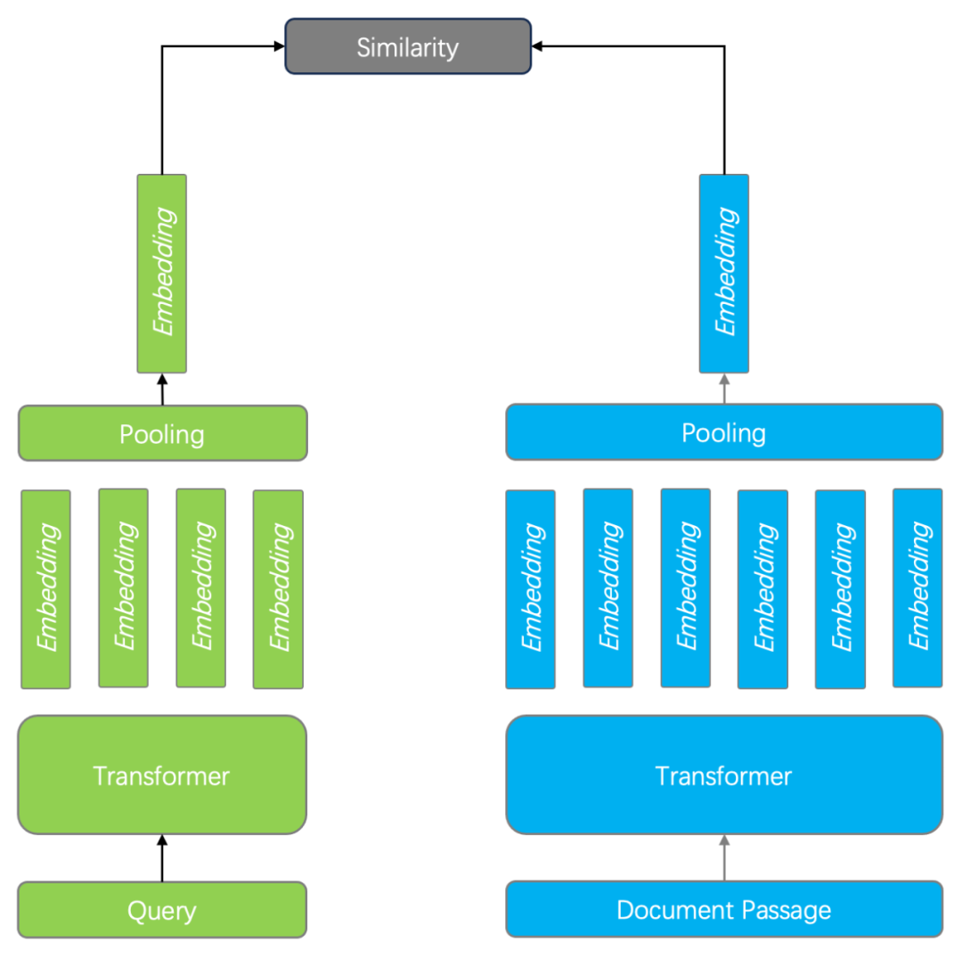 1. 双编码器。以 BERT 模型为例,它针对查询和文档分别编码,最后再经过一个 Pooling 层,使得输出仅包含一个向量。在查询时的 Ranking 阶段,只需要计算两个向量相似度即可,如下图所示。双编码器既可以用于 Ranking 也可以用于 Reranking 阶段。由于双编码器针对查询和文档分别编码,因此无法捕获查询和文档的 Token 之间的复杂交互关系。