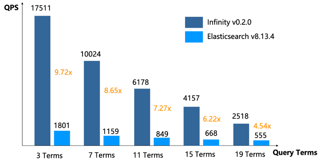 上图是 Infinity 和 Elasticsearch 的全文搜索性能对比,测试方法如下: