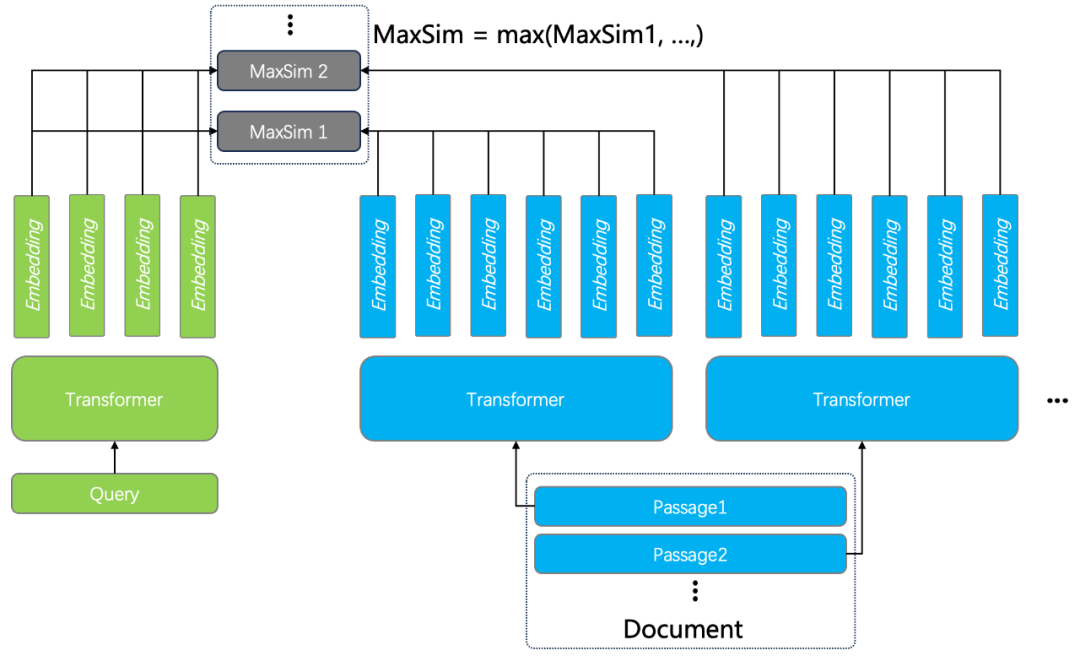 一篇超过 ColBERT 限制的文档,会被切分成多个段落,分别编码生成 Tensor 后,都跟原始文档保存在一行。计算 MaxSim 的时候,查询跟这些段落分别计算,然后取最大值作为整个文档的打分。