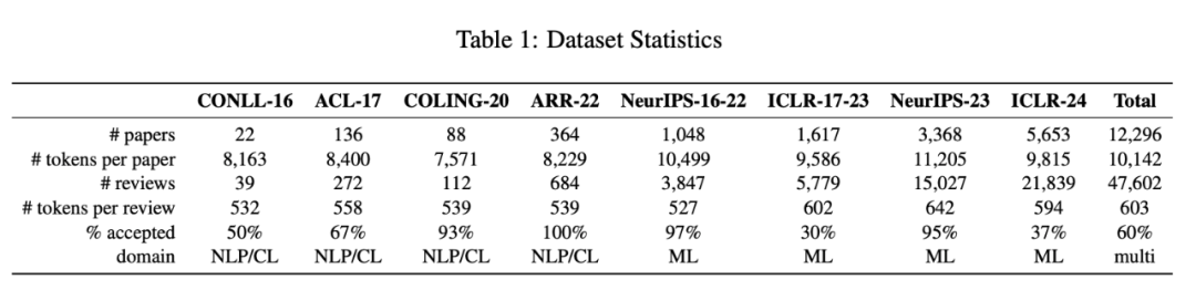 本文爬取了OpenReview上NeurIPS-2023和ICLR-2024数据,其中90%的数据作为训练数据,剩下的10%作为测试集。此外测试集还包括REVIEWER2、PeerRead、NLPeer的数据。