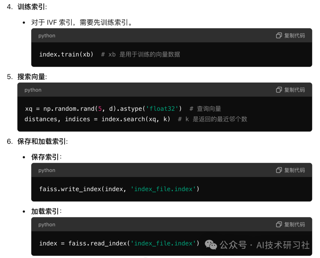 Faiss 向量检索库的应用 Faiss 是一个高效的向量检索库,由 Facebook AI 研究团队开发,广泛用于高维向量的相似性搜索和聚类。以下是一些 Faiss 常用的操作: