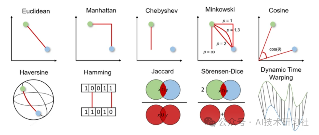 什么是向量距离?向量距离,也称为距离度量或相似度度量,是一种数学函数,用于量化两个向量之间的相似性或差异性。这些向量可以代表各种数据集,向量距离有助于理解向量在特征空间中的接近程度或远离程度。因此,向量距离在各种机器学习算法中至关重要,使这些算法能够基于向量之间的关系做出决策。 对于距离的度量,我们可以在几何距离测量和统计距离测量之间进行选择,应该选择哪种距离度量取决于数据的类型。特征可能有不同的数据类型(例如,真实值、布尔值、分类值),数据可能是多维的或由地理空间数据组成。 机器学习中向量距离的应用场景有哪些? 千万不要低估向量距离的力量。向量距离在机器学习领域中有着广泛的应用场景。 首先,在聚类任务中,向量距离能够帮助将相似向量分组成簇。诸如k-均值、层次聚类和DBSCAN等算法依赖向量距离来确定哪些向量属于同一簇。 在分类任务中,kNN分类等算法通过计算某向量与其k个最近邻向量的距离来确定其分类,从而将该向量分配到其近邻最多的聚类中。在自然语言处理(NLP)中,向量距离被用于计算文档相似度、执行情感分析和对文本文档进行聚类。 在数据预处理步骤中,向量距离对于特征缩放、归一化和去除异常值至关重要,确保数据能够更好地适应机器学习算法。 在神经网络训练中,向量距离作为损失函数或正则化项,鼓励输出向量和目标向量之间保持一定的关系,从而提高模型性能。异常检测任务中,通过测量向量与中心簇或其他向量的距离,可以检测出异常或离群值,这些向量因远离大多数向量而被视为异常。 降维技术如UMAP和t-SNE利用向量距离在高维数据中创建低维表示,尽可能保持成对距离,帮助数据可视化和理解。 总之,向量距离是许多机器学习任务和应用的基石,选择合适的向量距离对算法的能力及其捕捉向量数据之间关系至关重要。 有哪些向量相似度类型? 1、欧氏距离 Euclidean distance 欧氏距离度量两个实值向量之间的最短距离。由于其直观,使用简单和对许多用例有良好结果,所以它是最常用的距离度量和许多应用程序的默认距离度量。 欧氏距离也可称为l2范数,其计算方法为:
