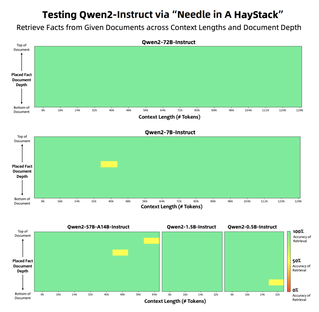 图 1: Qwen2 指令微调模型在 "Needle in a Haystack" 测试中的表现。