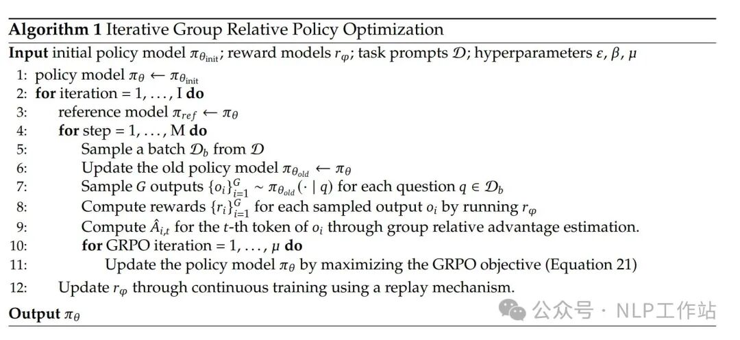 - RLHF: 采用了 GRPO 来节省 RL 训练的成本,主要是将 PPO 过程中的 advantage 替换成了 ,因此在 RLHF 过程中就不需要 Value model 了。具体算法如下: