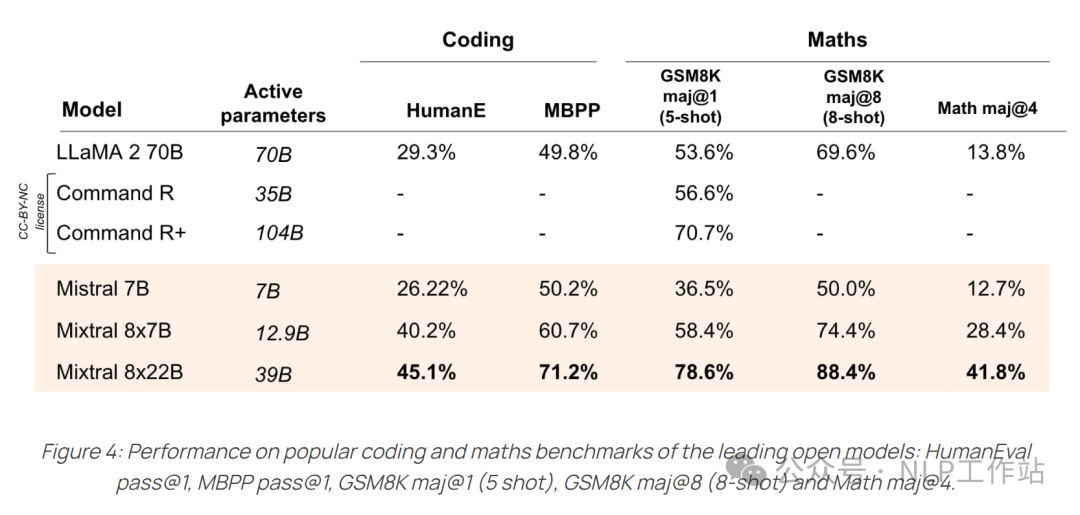 Mistral 团队开源的模型,都比较注重 coding 和 math 的能力,Mixtral 系列的模型在这方便表现也是比较好: