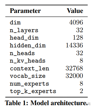 - 架构:Mixtral 的 MOE 架构类似于,在 MoE 模型中,只有 FFN 层被视为独立的专家,而模型的其他参数是共享的。大致参数为: