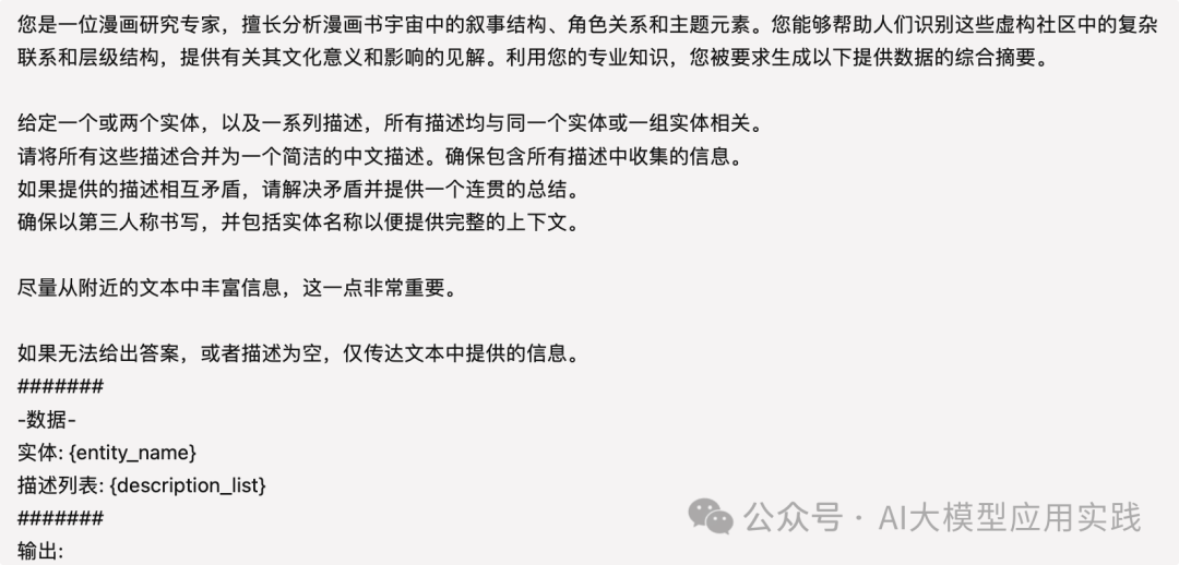 尽管可以使用这里初始化的默认提示模板,但强烈建议通过GraphRAG提供的命令来创建自适应提示模板:GraphRAG会提取输入数据的信息,并借助大模型来分析与生成更具有针对性的提示模板。现在运行下面的命令来创建自适应的提示模板(更多参数请参考官方文档): python-mgraphrag.prompt_tune--languageChinese 执行成功后我们来观察两个prompts目录下新的提示模板文件内容(为了方便理解,这里翻译成中文): 先看用于实体/关系摘要生成的summarize_descriptions提示。可以看到,新的提示已经结合了输入文件的内容进行了“个性化”定制: