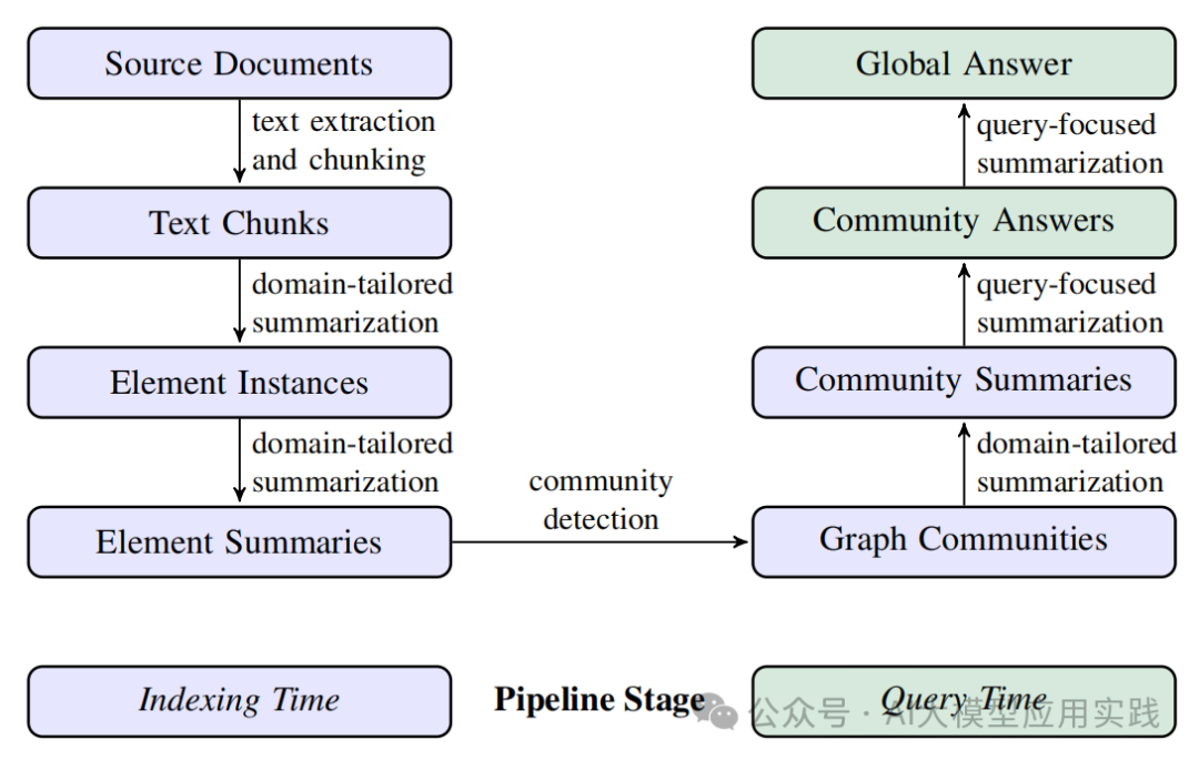 图片来自微软论文 这个过程的独特之处在于:它把原始的自然语言文本转化与压缩为图谱,然后又把图谱总结回自然语言。即从自然语言文本-->结构化的知识图谱-->自然语言摘要。由于转化的知识图谱已经组合了来自多个原始文档的实体与关系信息,因此最后基于社区的自然语言摘要也就包含了跨多个数据源与文档的浓缩信息。因此可以更好的用来回答QFS问题。 Microsoft GraphRAG对这个过程的实现可以参考论文中的描述: