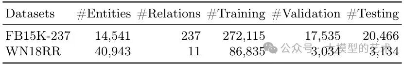 数据集。在实验中,我们使用两个基准数据集,FB15K-237和WN18RR,来评估我们提出的框架。FB15K-237由真实世界的命名实体及其关系构成,基于Freebase构建。另一方面,WN18RR包含英语短语及其之间的语义关系,基于WordNet构建。值得注意的是,这两个数据集是从其先前版本(即FB15K和WN18)更新而来的,均移除了某些逆边以防止数据泄漏。有关详细概述,这两个数据集的统计信息见表1。