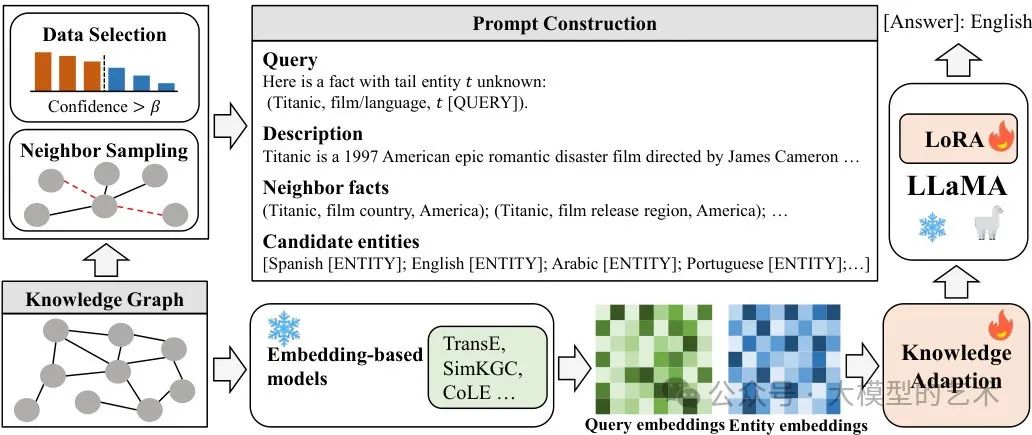 然而,使用参数高效的微调方法训练LLM仍然成本高昂。为了进一步降低微调的计算成本,我们设计了一种截断采样方法,可以从知识图谱中选择有用的样本用于指令构建。假设我们得到了一个用于微调的示例,查询为,答案实体为。我们使用预训练的基于嵌入的模型计算事实的分数和的排名。然后,截断采样方法根据事实的分数和答案实体的排名决定是否丢弃该示例。为了释放LLM在知识图谱上的图推理能力,我们将查询和候选实体的嵌入知识注入LLM,以进一步增强其能力。