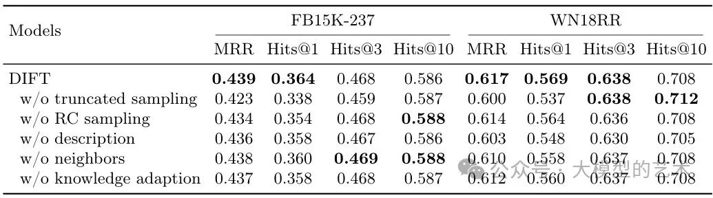 我们在表2中报告了FB15K-237和WN18RR上的链接预测结果。总体而言,我们提出的框架DIFT在两个数据集的大多数指标上都达到了最佳性能。