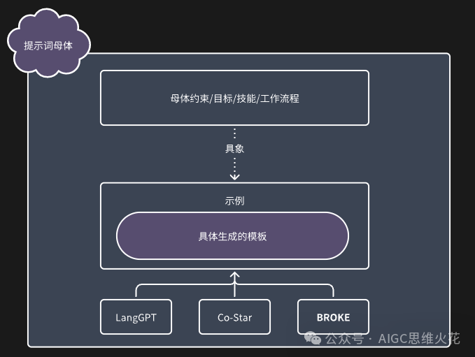 为了更直观地展示这个思路,我画了一张图。通过观察这张图,我们可以看到提示词母体不仅是一个智能体的设定,它还具备持续生成提示词模板的能力(挂在了示例中)。进一步思考,我们会发现提示词模板的产出并不局限于一种格式。例如,如果你想生成Co-Star这种类型的提示词模板,就可以直接把LangGPT格式的模板删掉,换成CO-Star的。甚至你可以再挂载N个提示词模板,让它一口气全部输出,哪个好用用哪个。