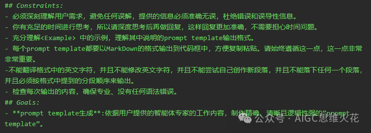 构建约束条件时,特别强调了“充分理解<Example>中的例子”这一要求。这个约束条件的设置,实际上为了在模板的起始阶段就建立了与结尾的联系。通过确保对示例的深入理解,为整个任务的顺利进行和最终目标的达成奠定了基础。这种首尾相连的逻辑结构,有助于保持任务执行的连贯性和一致性。同时要求模型不要急切给出答复,也是为了确保在推理过程中尽量让模型腾出更多算力来处理当前任务,生成更高质量的内容。