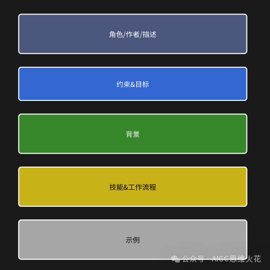 让我们暂时放下对细节的延伸,集中注意力回到提示词母体的结构上。通过下方提供的简图,我们可以清晰地看到模板被划分为五个主要部分:角色设定、目标&约束、技能描述、工作流程以及具体示例。请注意,这个结构顺序不是随意排列的,这样的布局基于大模型注意力机制,因为模型倾向于更多地关注提示词的开头和结尾部分,所以我将约束和具体示例分别放置在模板的头部和尾部,以规范模型的理解和输出内容。而模板的中间部分则包含了角色的技能、背景和工作流程,这些模块用来补充整个模板的内容,帮助减少幻觉,提升整个模板的健壮性。