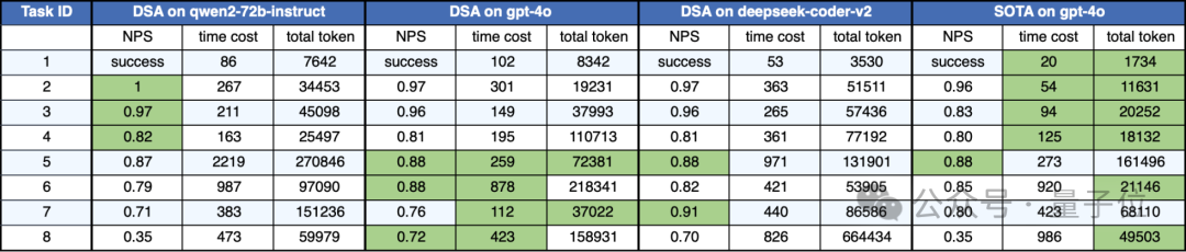 实验效果我们使用ML-Benchmark作为测试集(指路论文“Data Interpreter: An LLM Agent For Data Science”),分别从Normalized Performance Score (NPS) ,total time,total token三个维度对DS Assistant效果进行评测。 其中NPS是一种将不同任务或模型的性能指标标准化的方法,使得不同指标之间可以进行比较。 它的计算通常涉及以下步骤: 步骤1:确定指标优化方向,判断性能指标是“越大越好”还是“越小越好”。 步骤2:规范化计算。如果指标是“越大越好”(如准确率、F1分数、AUC),NPS等于原始值;如果指标是“越小越好”(如损失值),则需要将原始值映射到接近1的较高NPS值。 规范化后的性能得分范围通常是0到1,其中1表示最优性能,0表示最差性能。 实验任务详情和结果如下( 绿色代表当前任务下最优指标 ):
