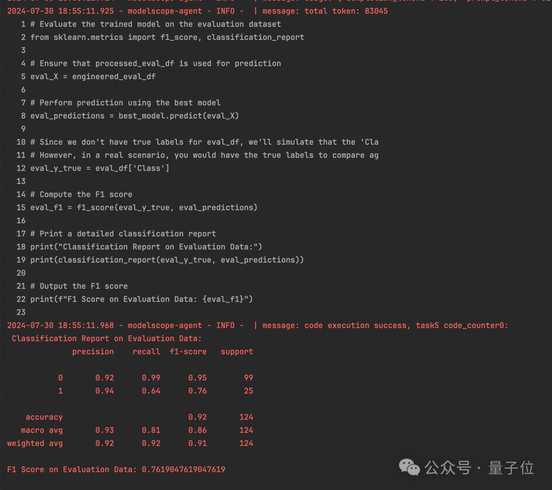Task 5:模型验证DS Assistant选择了训练集中F1分数最高的模型对验证集进行测试,并计算了这个模型在验证集上的F1分数,成功地完成了任务。