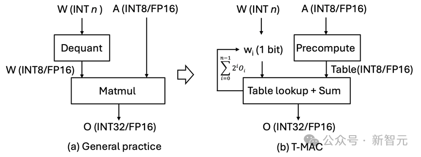 图3 混合精度GEMV基于现有反量化的实现范式vs T-MAC基于查找表的新范式