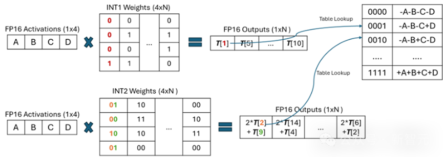 同时,对于不同精度的激活向量(float16/float32/int8),仅有构建表的过程需要发生变化,在查表的时候不再需要考虑不同的数据结构。