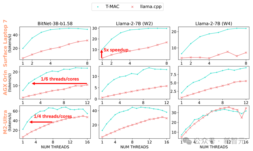 图2 在不同端侧设备CPU(Surface Laptop 7, NVIDIA AGX Orin, Apple M2-Ultra)的各核数下T-MAC和llama.cpp的token生成速度可达llama.cpp的4-5倍。达到相同的生成速率,T-MAC所需的核心数仅为原始llama.cpp的1/4至1/6