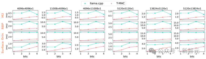 图5 使用不同端侧设备CPU的单核,T-MAC在4到1比特的混合精度GEMV算子相较llama.cpp加速3-11倍。T-MAC的GEMM耗时能随着比特数减少线性减少,而基于反量化的llama.cpp无法做到(1比特llama.cpp的算子性能由其2比特实现推算得到)
