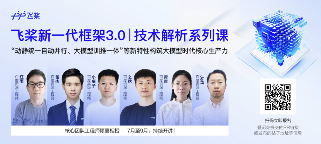 7月至10月特设《飞桨框架3.0全面解析》直播课程,技术解析加代码实战,带大家掌握核心框架、分布式计算、产业级大模型套件及低代码工具、前沿科学计算技术案例等多个方面的框架技术及大模型训推优化经验,实打实地帮助大家用飞桨框架3.0在实际开发工作中提效创新!