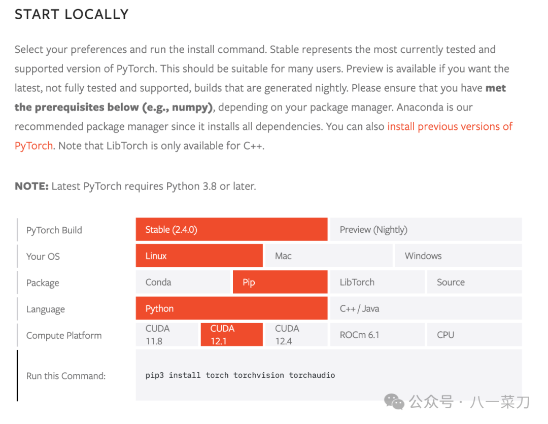 3、安装Pytorch等环境依赖信息⚠️ 在安装Pytorch时,需要保证和cuda驱动版本保持一致,不然会出现各种莫名其妙的问题 版本选择参考:https://pytorch.org/get-started/locally/ 通过conda创建一个新的环境,然后切换后安装依赖包