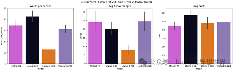 从图 3 可以看出,LLaMA 3 8B 是最快的 LLM,平均每秒产生约 43 个单词。在答案长度方面,Mistral 7B 生成的答案较长,平均答案长度为 24 个单词,明显多于 LLaMA 70B,后者仅生成 8 个单词。最后,根据独立 LLM 的排名,Mistral 7B 的平均排名最佳,约为 2.25,而 LLaMA 3 8B 的表现最差,平均排名约为 2.8。