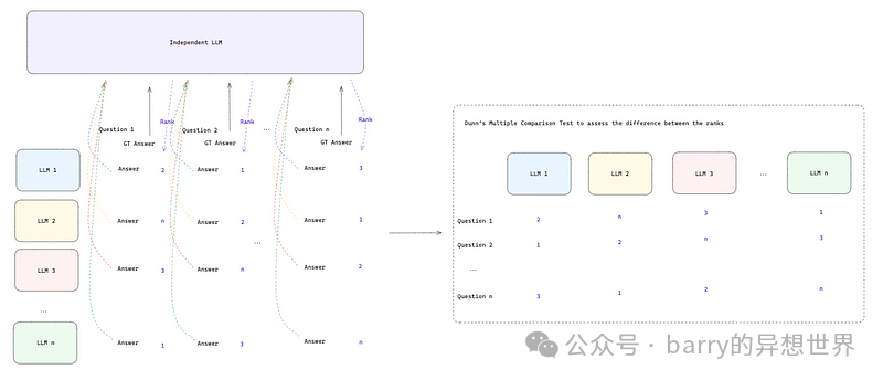 我们多次运行此过程并记录所有提供的排名。在收集所有问题的排名后,我们执行邓恩多重比较检验[2]。它帮助我们了解所有LLM的排名之间是否存在显著差异,或者它们的表现是否相似。此检验对每个独立组进行成对比较,并告知哪些组在预定义的显著性水平(通常为5%)上统计显著不同。