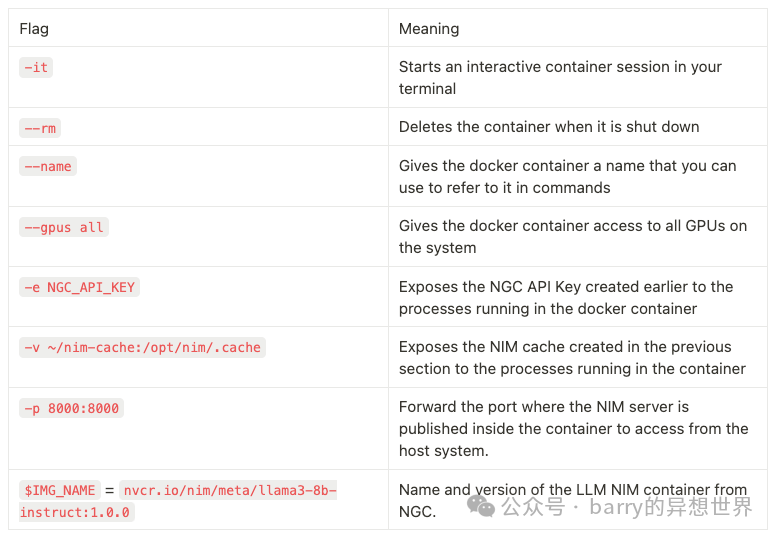 # 启动 LLM NIM docker run -it --rm --name=$CONTAINER_NAME \ --runtime=nvidia \ --gpus all \ --shm-size=16GB \ -e NGC_API_KEY \ -v "$LOCAL_NIM_CACHE:/opt/nim/.cache" \ -u $(id -u) \ -p 8000:8000 \ $IMG_NAME