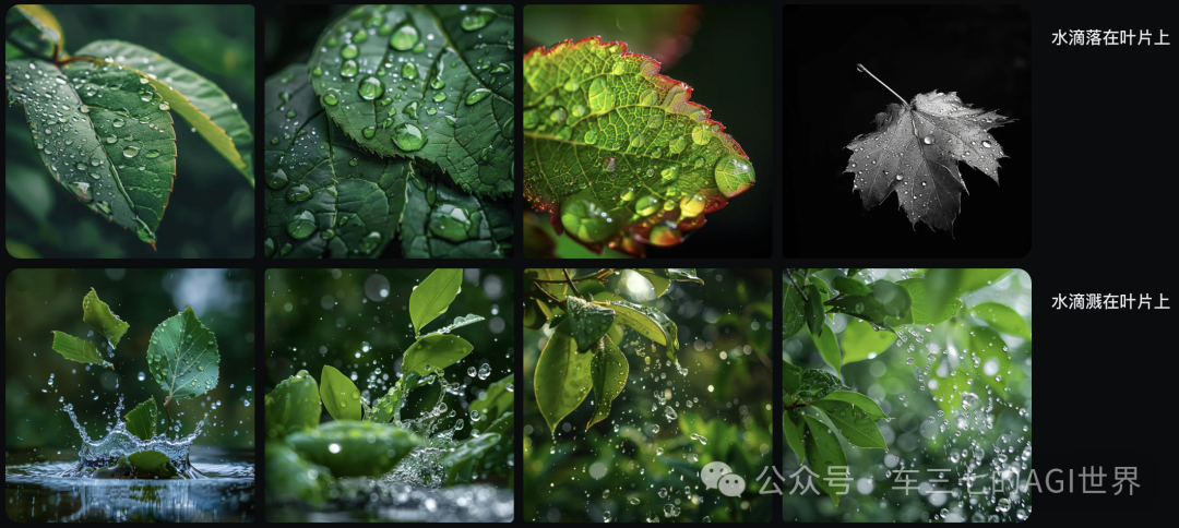 3. 动词: 用来描述动作、状态或行为的词语,如“跑”、“看”、“思考”等。 一般来说这样的词表达了画面主体的动作,是一幅画传神或灵魂所在,所以使用动词应精确具体,不建议让AI随便猜测,否则AI无法画出你的期望。 例如“水滴溅在叶片上”生成的图片就比“水滴落在叶片上”更具动感。