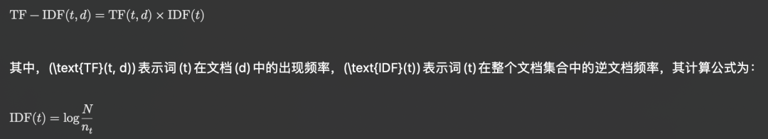 TF-IDF是一种统计方法,用于评估一个词在文档集合中的重要性。词频(TF)表示一个词在文档中出现的频率,而逆文档频率(IDF)衡量词在整个文档集合中的普遍性。TF-IDF的计算公式如下: