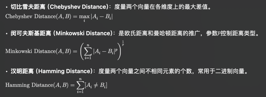 在向量数据库中,距离度量方法是检索过程中的重要组成部分。除了余弦相似度、欧氏距离和曼哈顿距离外,还有其他几种常用的距离度量方法: