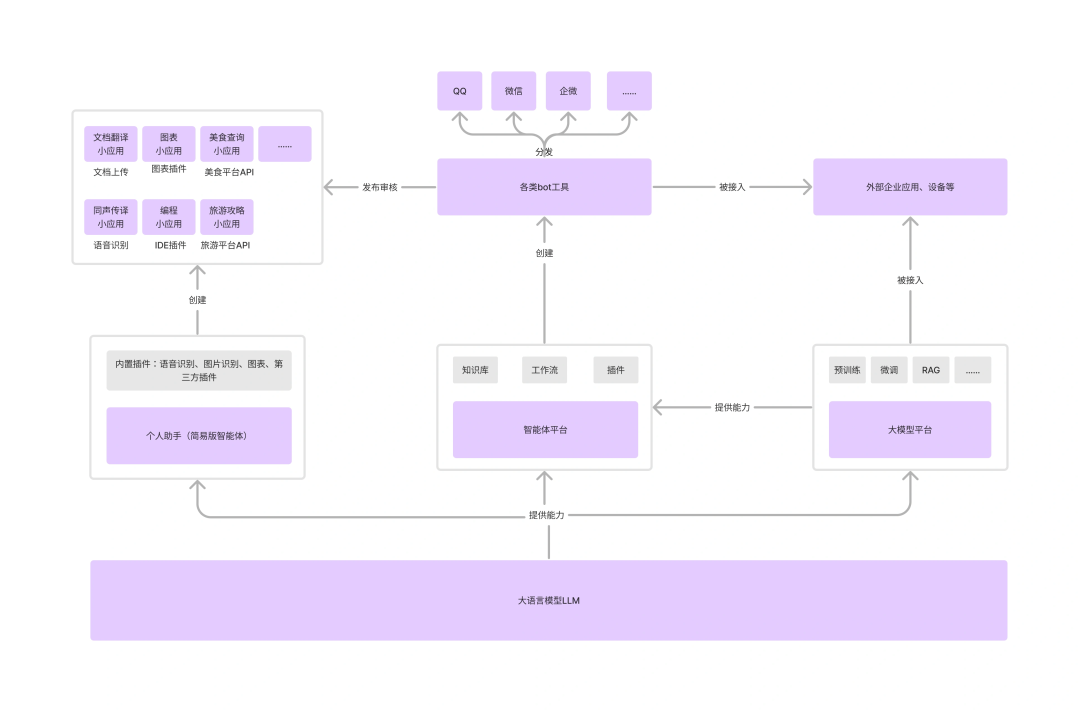 下面以LLM目前能力释放的情况,看看智能体、AI个人助手、大模型平台的关系。