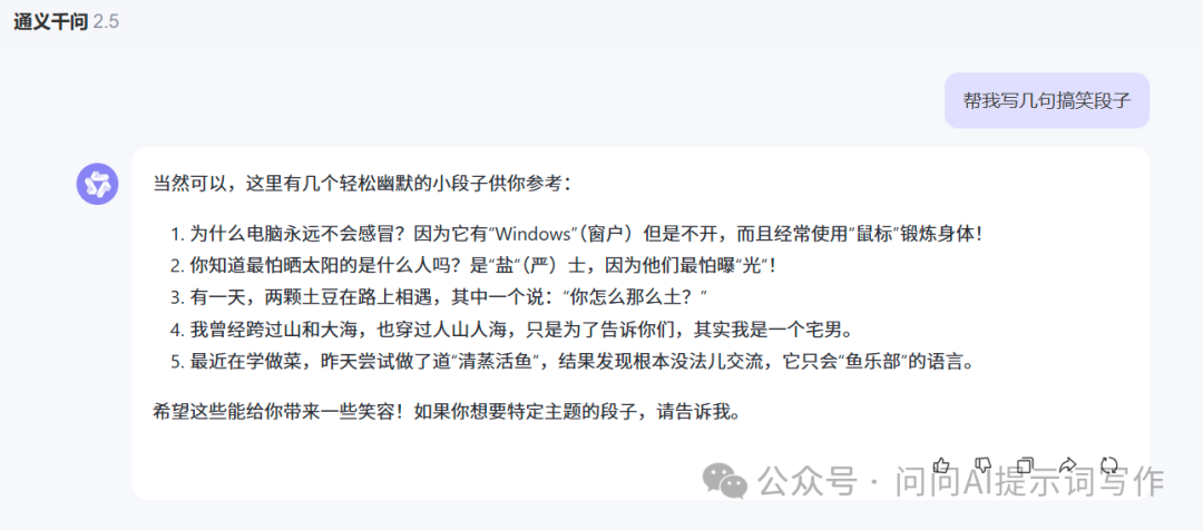 提供文本示例,俗称“投喂”,我们刚刚说了,我们与通义千问交流时,存在“隐私区”,也就是“你知道,通义千问不知道’ 例如我想让通义千问帮我写几句搞笑段子,它的回复是: