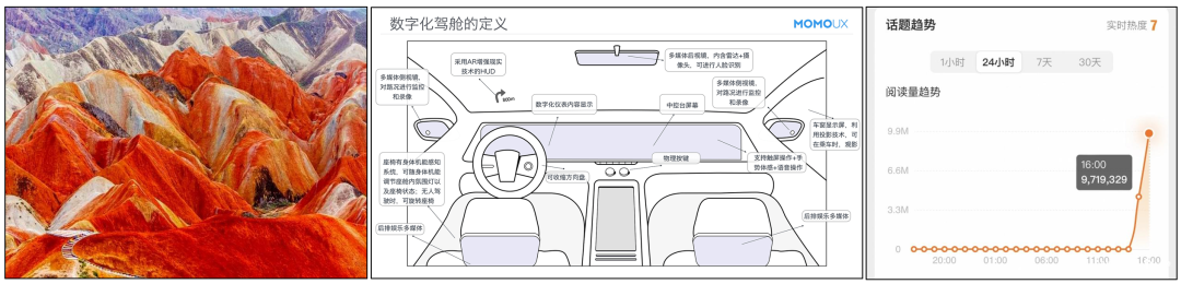 对于以上三幅图,最左侧的丹霞地貌,很难用文字捕捉所有信息, 虽然可以用文字进行描述,但整体的“视觉效果”很难完全用语言表达。在多模态 RAG 中,如果用户查询与此相关的内容,系统可能需要更多依赖视觉特征的向量来进行检索和匹配,而不仅仅是依赖文本描述。 在中间智能驾舱的图示中,一部分细节可以用文字描述,如驾舱中每个设备的信息和位置。这种图像的检索可能需要结合文本和图像信息,利用文本描述来增强对关键点的理解,同时利用图像特征来捕捉整体的视觉信息。 最右侧的图是小米 SU7 话题趋势,这种图像的细节可以完全用文字描述, 这类信息的检索和处理可以较多地依赖文本向量,而图像向量的作用可能相对较小。 构建多模态 RAG 主要方法包括: 将所有模态嵌入同一向量空间;