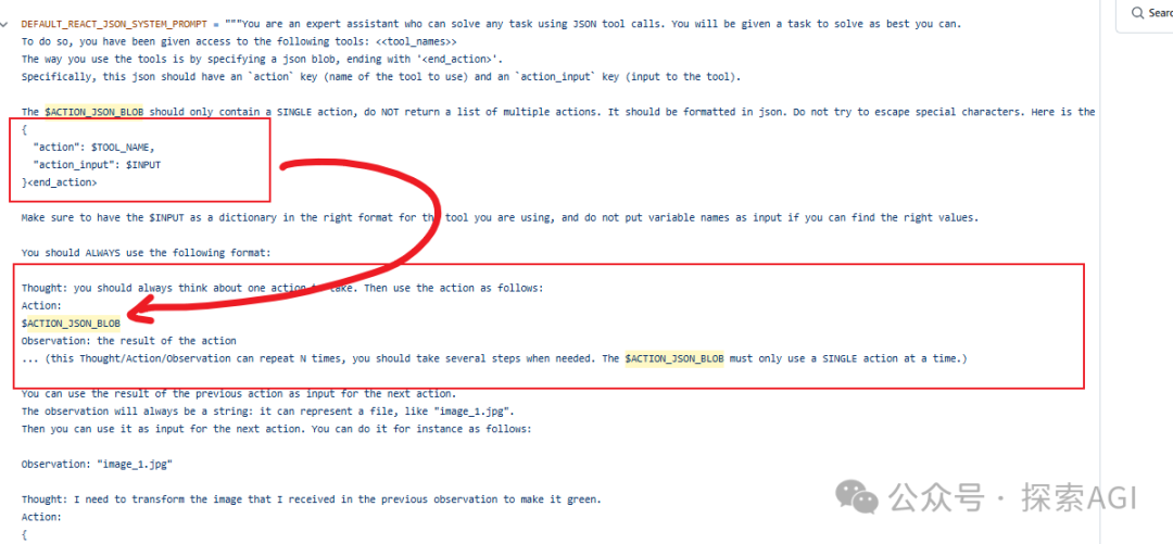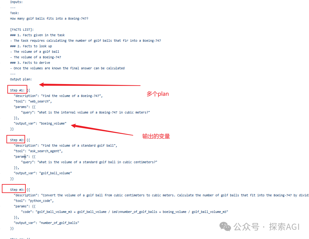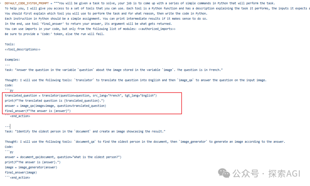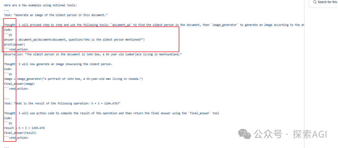 多步的有2种,一种用codeblock的形式,下图为codeAgent的示例,一次用一个codeblock生成所有的规划。下图为codeAgent的system prompt的示例部分,输出代码块