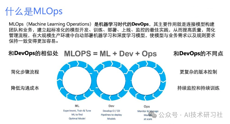 无论是在算法研究还是工程化过程中,当一个大语言模型的训练和微调完成后,都需要通过模型部署来实现业务落地,构建端到端的解决方案。 DevOps(Development and Operations)是一种结合了开发(Development)和运维(Operations)实践的软件开发方法论。DevOps 的核心目标是实现快速、高可靠、高质量的交付。它强调使用自动化工具和流程、持续集成与交付、监控和反馈,增强开发和运维团队之间的沟通协作,从而提高软件交付效率和系统稳定性。 MLOps中的ML是指Machine Learning,根据百科的定义,MLOps是一套在生产环境中部署和运维机器学习模型的可靠和高效的实践。著名的硬件厂商NVIDIA在其官方博客也给出了MLOps的定义,MLOps是企业在不断扩大的软件产品和云服务帮助下成功运行AI的最佳实践。 随着机器学习、深度学习和大语言模型的迅速发展,越来越多的系统开始集成各种算法模型,算法工程师也越来越多地参与到系统的开发工作和工程化工作中。DevOps的理念被应用到算法领域,并逐渐形成了MLOps和LMOps等主流的最佳实践。 MLOps在DevOps的基础上,增加了算法团队和模型构建业务,建立起规范化的数据准备、模型开发、模型训练、模型部署、模型上线和监控预警的机器学习最佳实践。针对MLOps,有人给出这样一个公式:MLOps = ML + Dev + Ops。